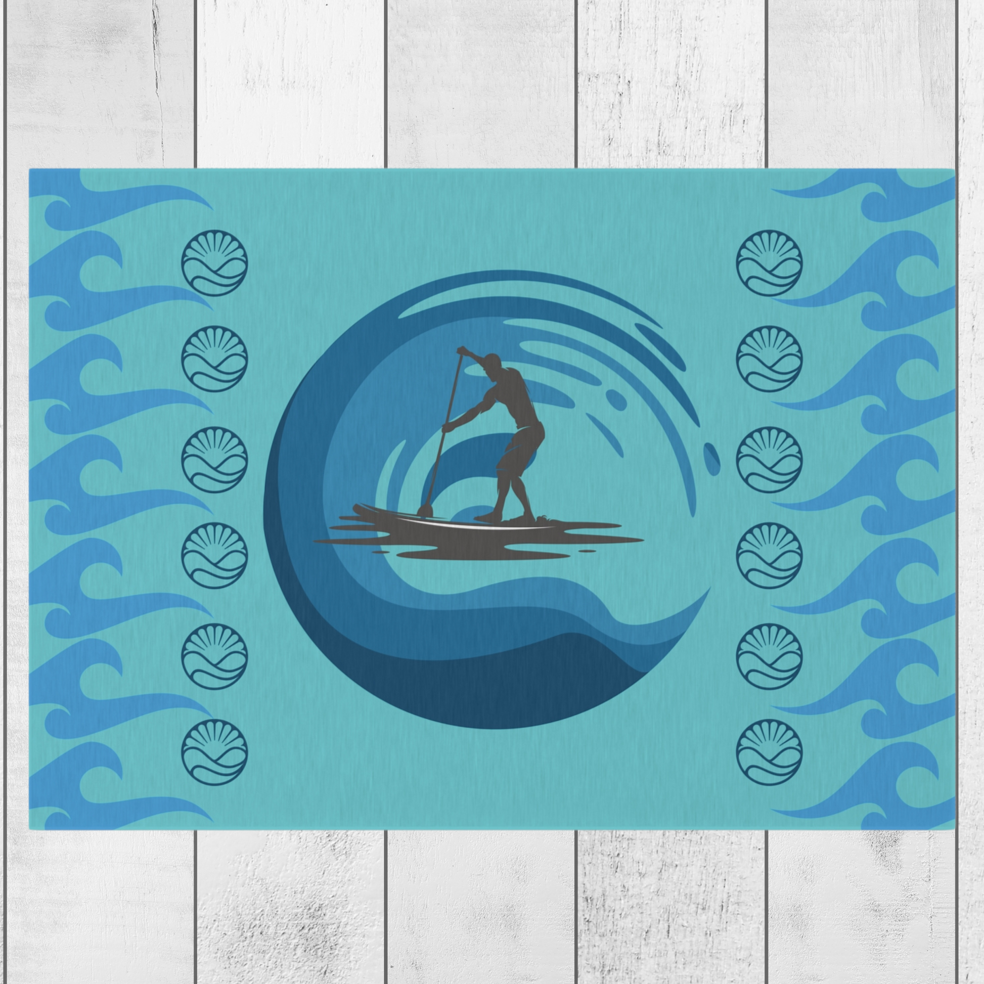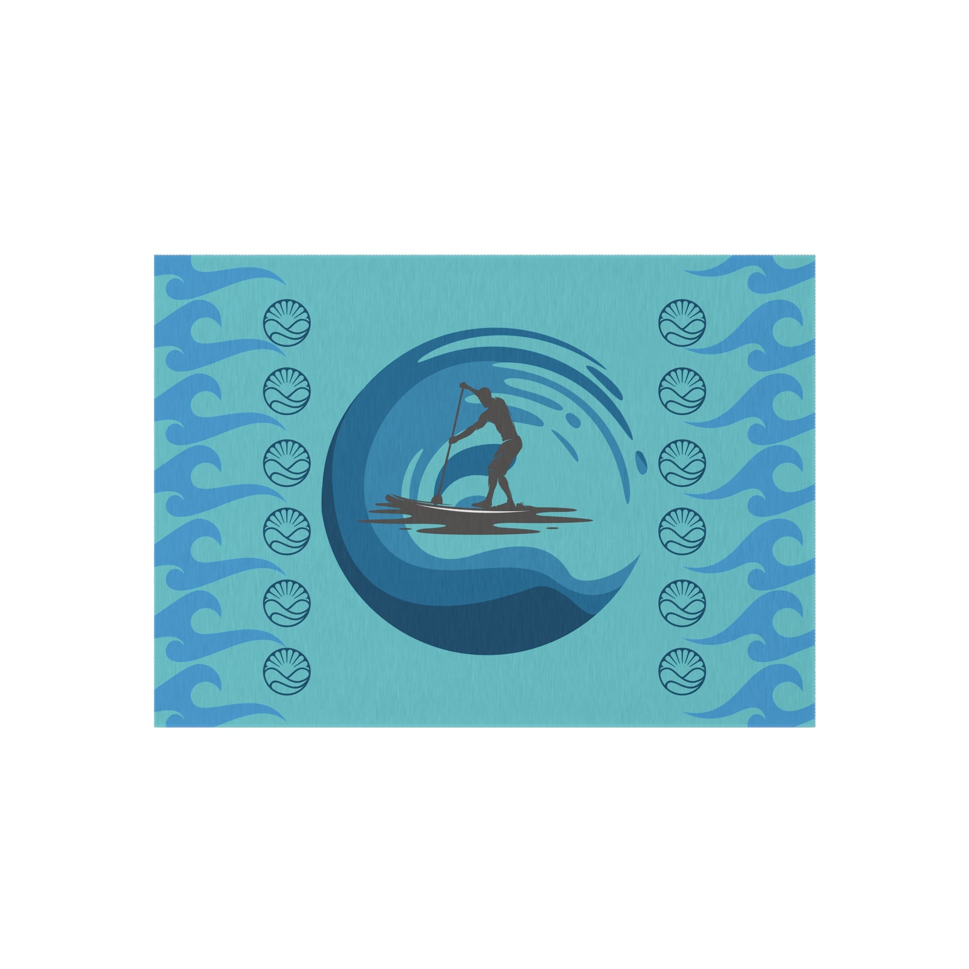 Blue Paddleboarder Racing Across the Waves Water and Mildew Resistant Outdoor Rug