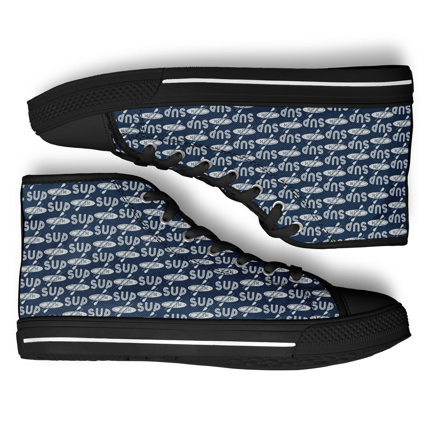 Sleek and sporty, these blue high tops with a light gray SUP and paddleboard pattern offer a subtle yet stylish way to represent the sport. Designed for comfort and durability, they’re perfect for any paddleboarding enthusiast on and off the water. Designed for both style and comfort, these shoes feature high-quality polyester canvas fabric that provides durability and a luxurious feel. The rubber outsole ensures excellent grip and longevity, making them perfect for everyday wear.