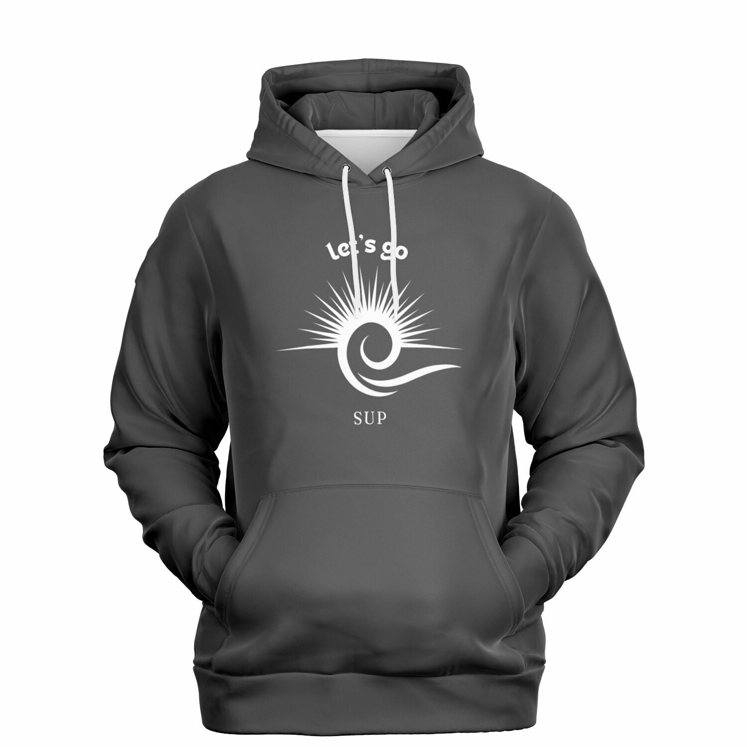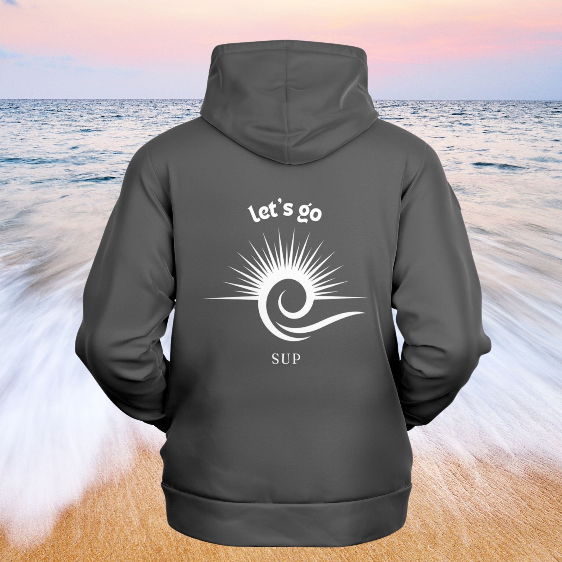Keep it simple yet bold with our athletic hoodie. Featuring a larger, eye-catching sun and wave design on the front and back. The text "Let’s Go SUP" surrounds the design, making it perfect for paddleboarders who love to stand out while staying cozy and comfortable.