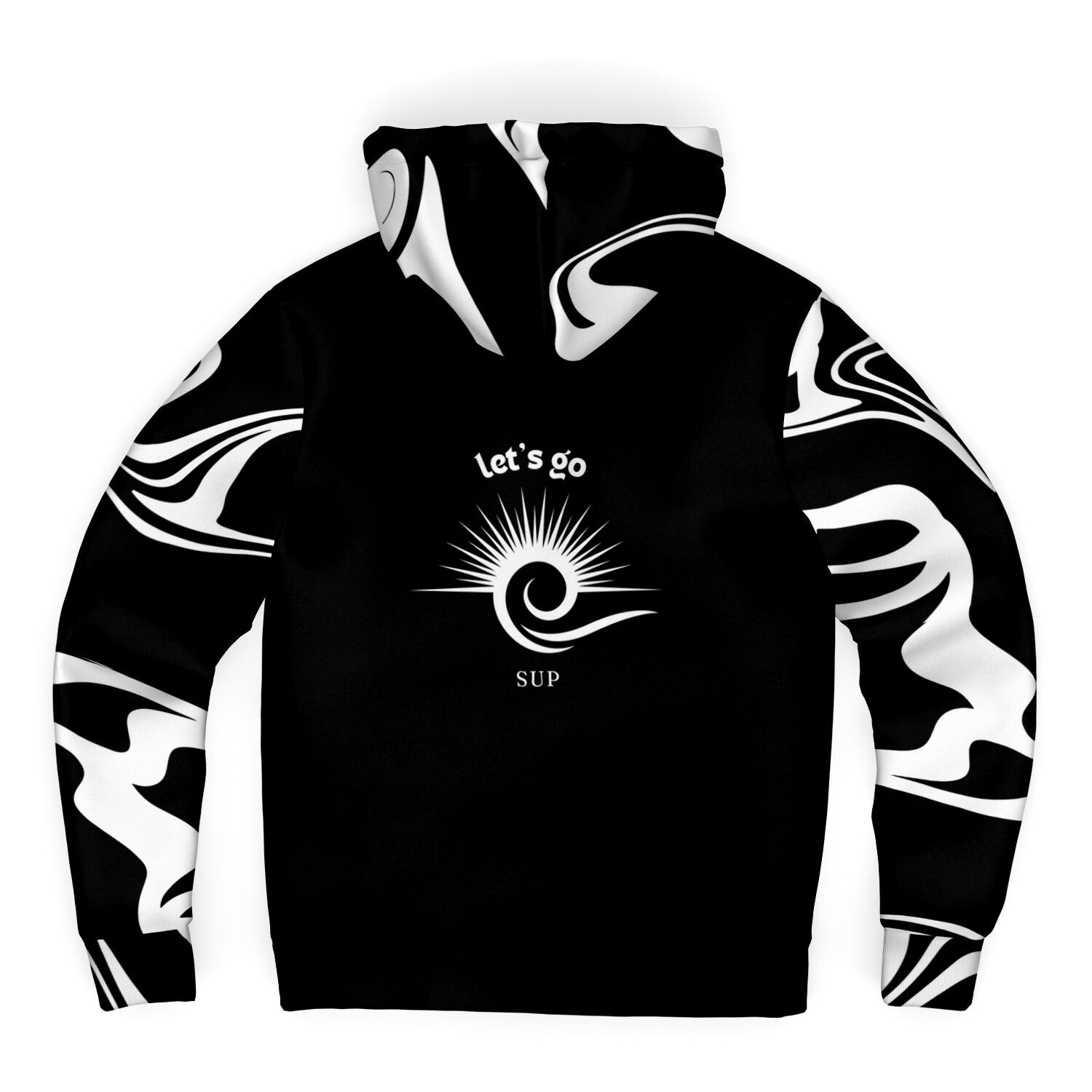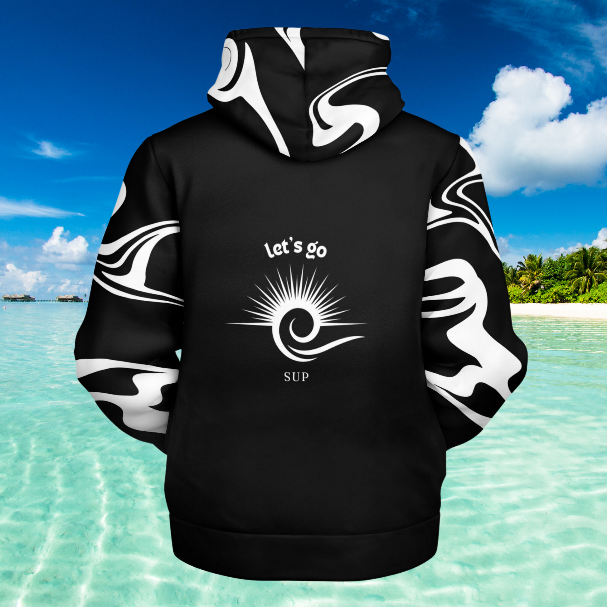 Step up your style game with this urban-inspired fleece hoodie, featuring abstract lines and waves that wrap around the sleeves and hood. The sun and wave design in black and white adds a modern twist, making this hoodie a must-have for guys who value both comfort and a contemporary look. Perfect for chilly days or coastal breeze, this hoodie blends warmth with cutting-edge style.