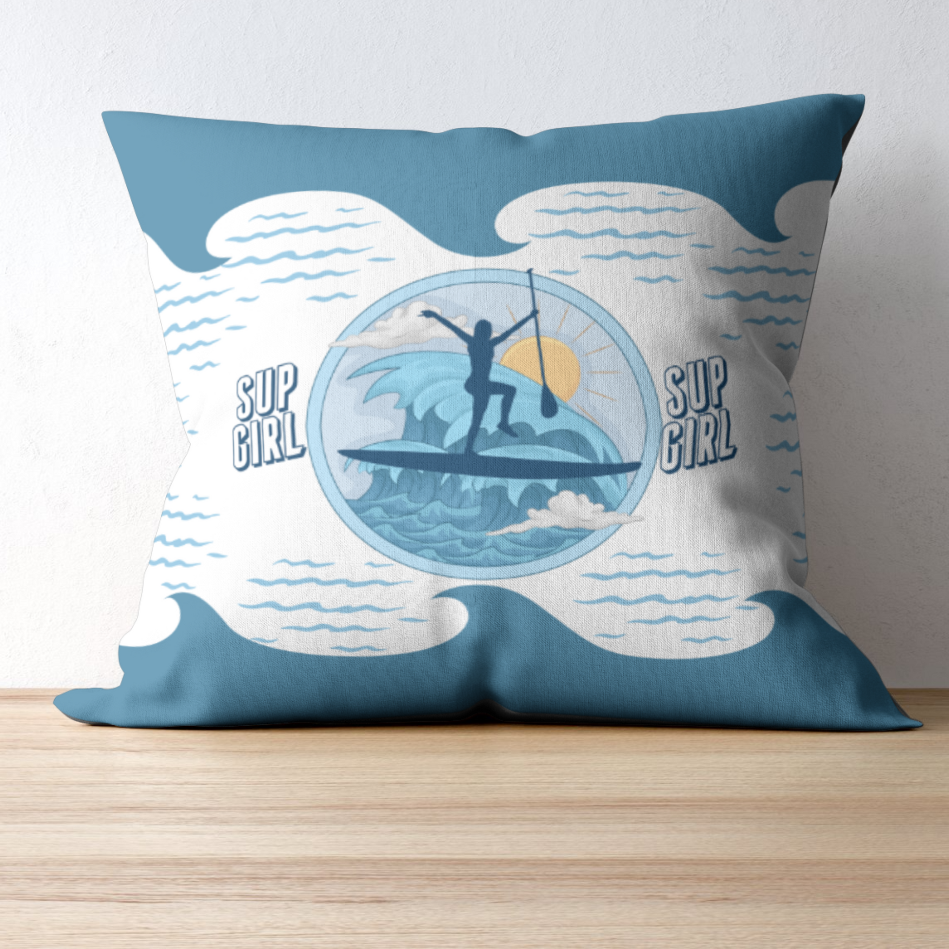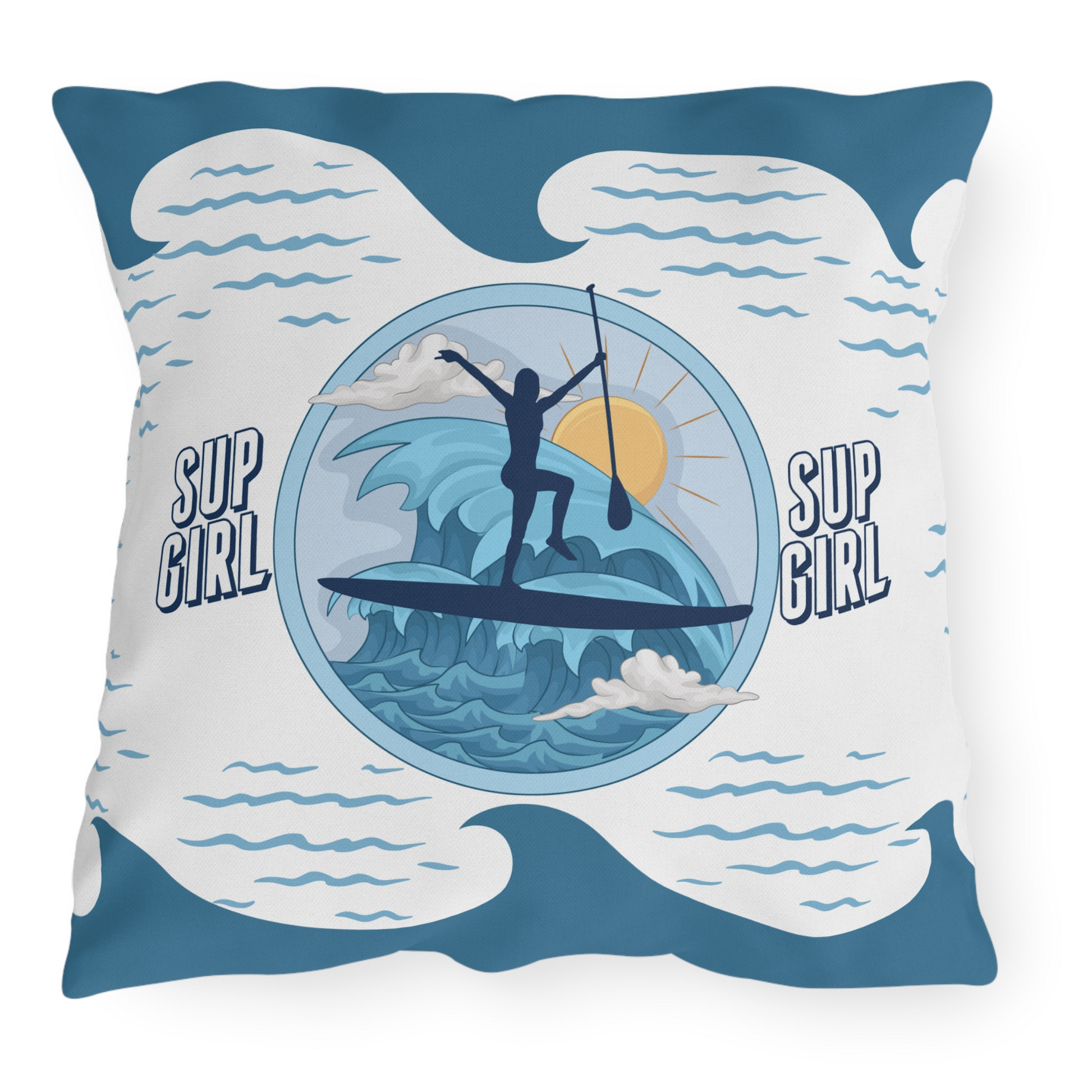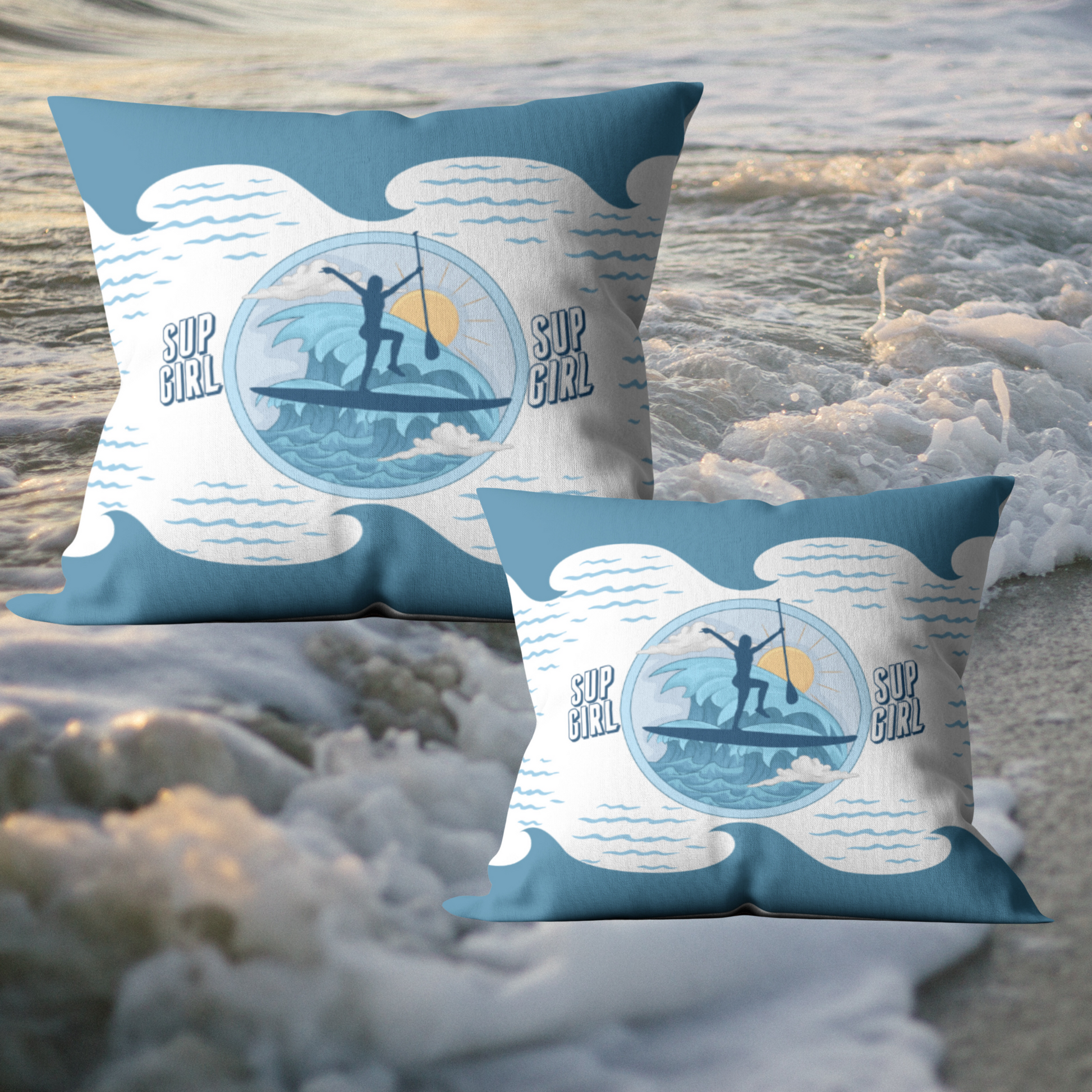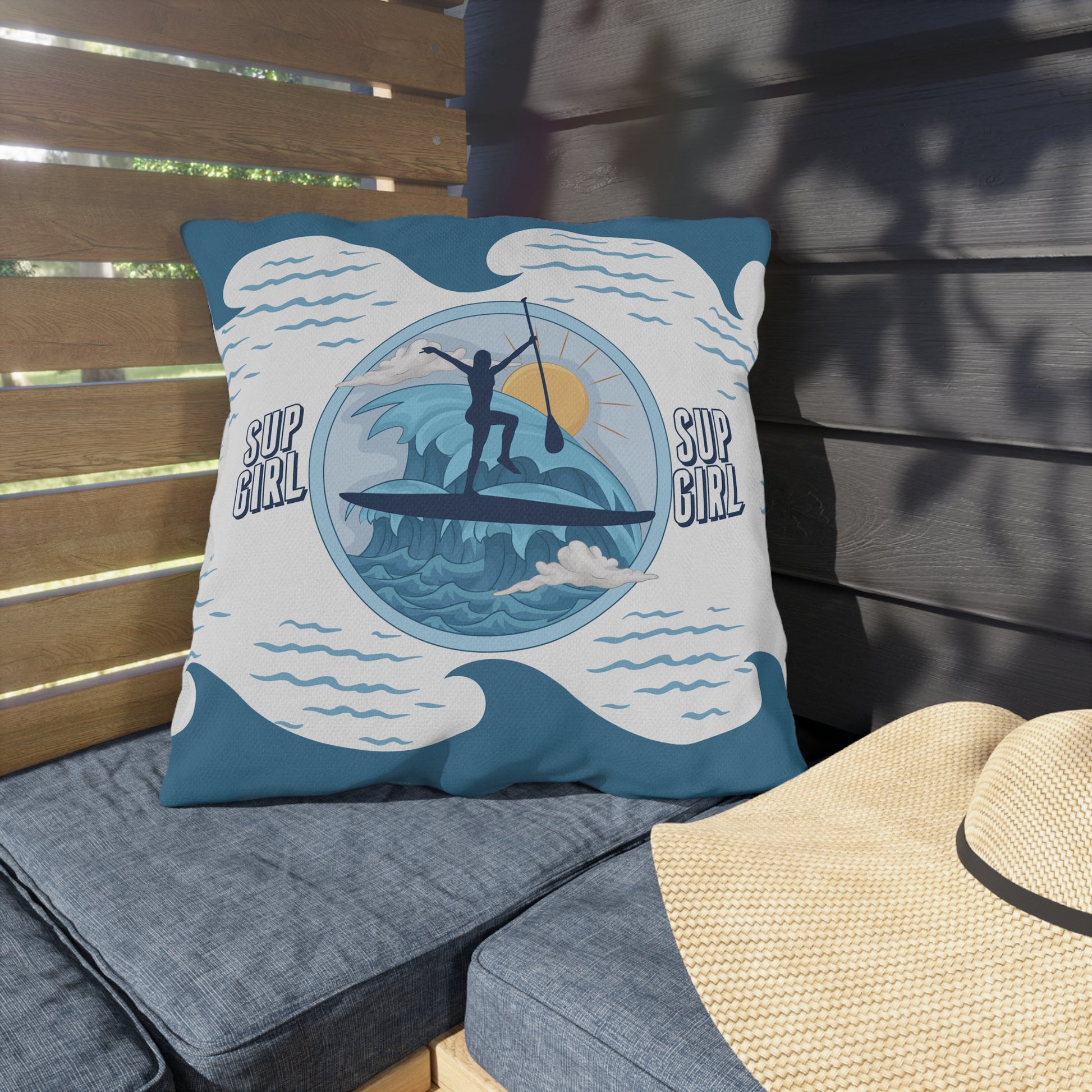 Blue Paddleboarder Girl on Board Water and Mildew Resistant Outdoor Pillows