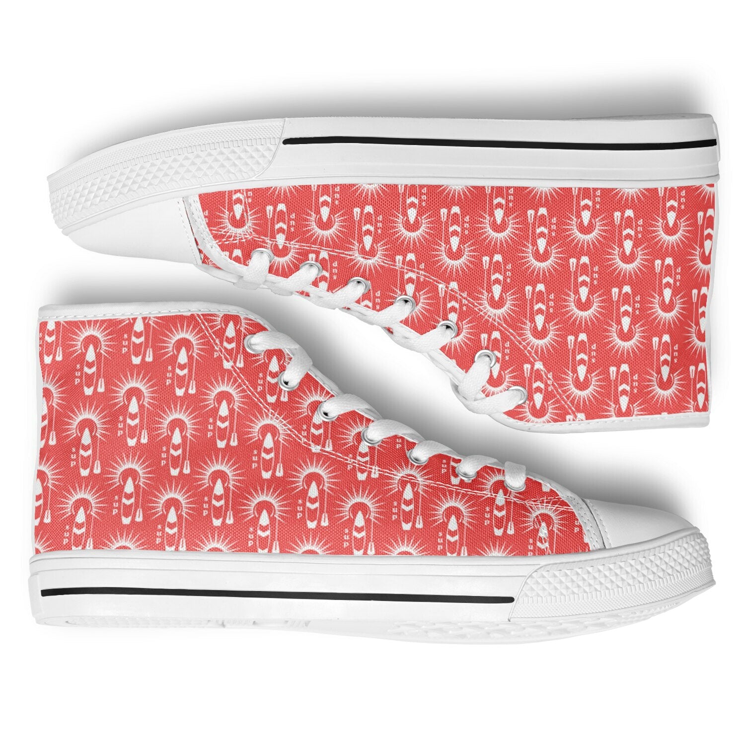 Get happy and show off your paddle passion with these red, sleek and trendy SUP themed high tops with modern white sun element and great looking board. Designed for both style and comfort, these shoes feature high-quality polyester canvas fabric that provides durability and a luxurious feel. The rubber outsole ensures excellent grip and longevity, making them perfect for your everyday wear.