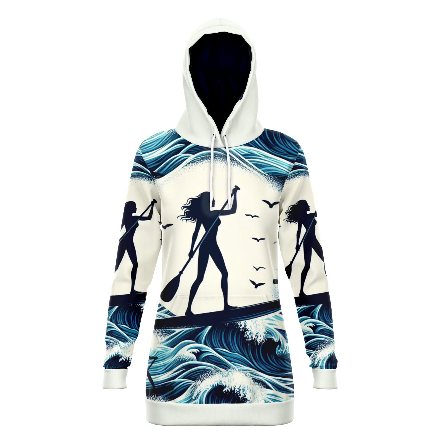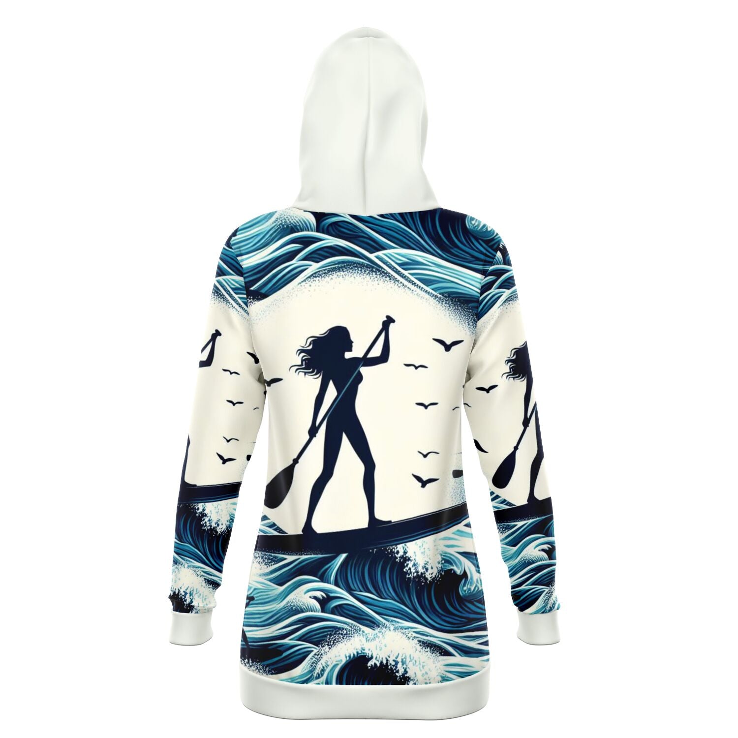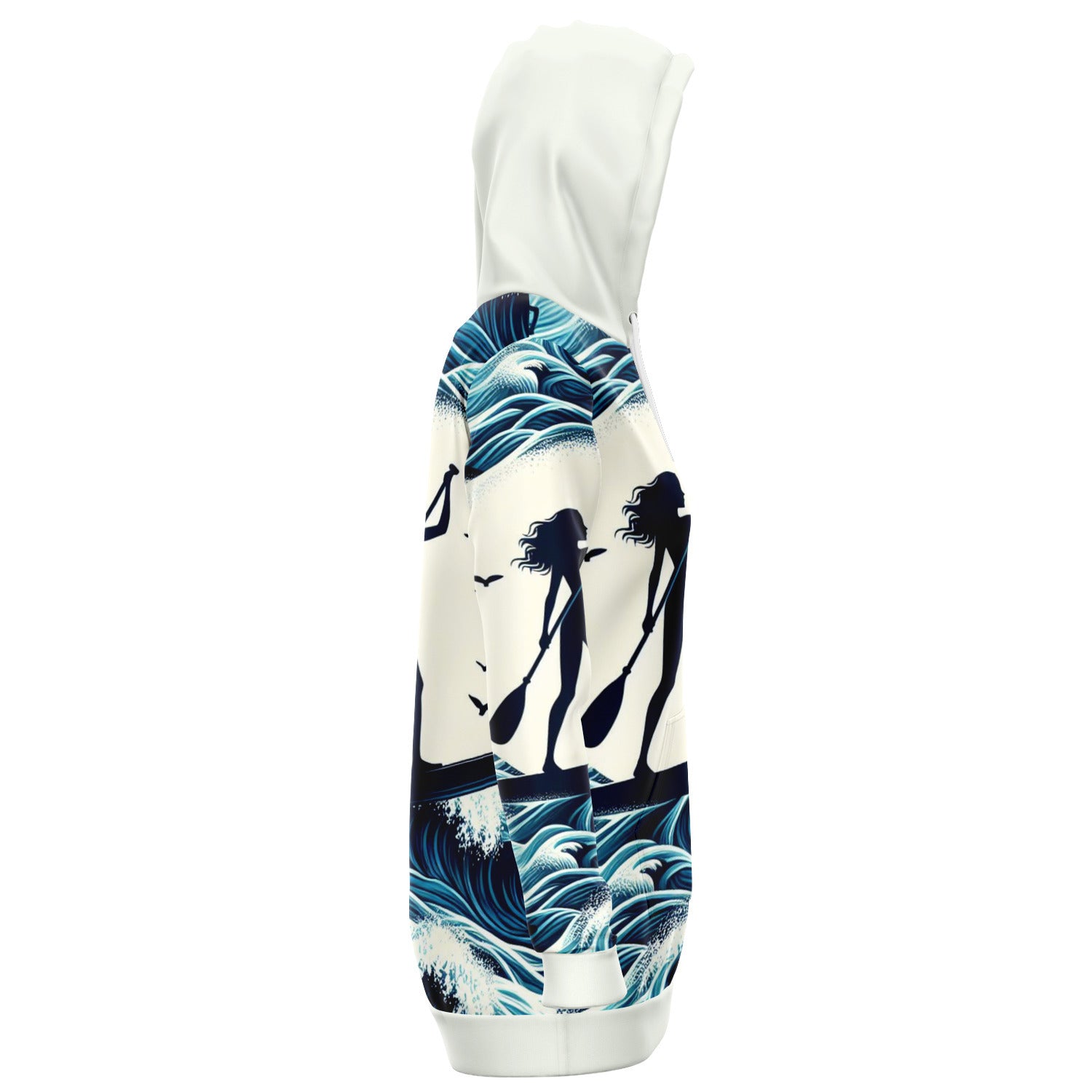 Absolutely stunning and one of our top sellers! This cozy longline hoodie features a beautiful whitish and blue color scheme with a unique paddleboarding woman design at the center of both the front and back, surrounded by gentle wave patterns. Whether you're an active paddleboarder or simply love the beach lifestyle, this hoodie is the perfect way to show off your passion.