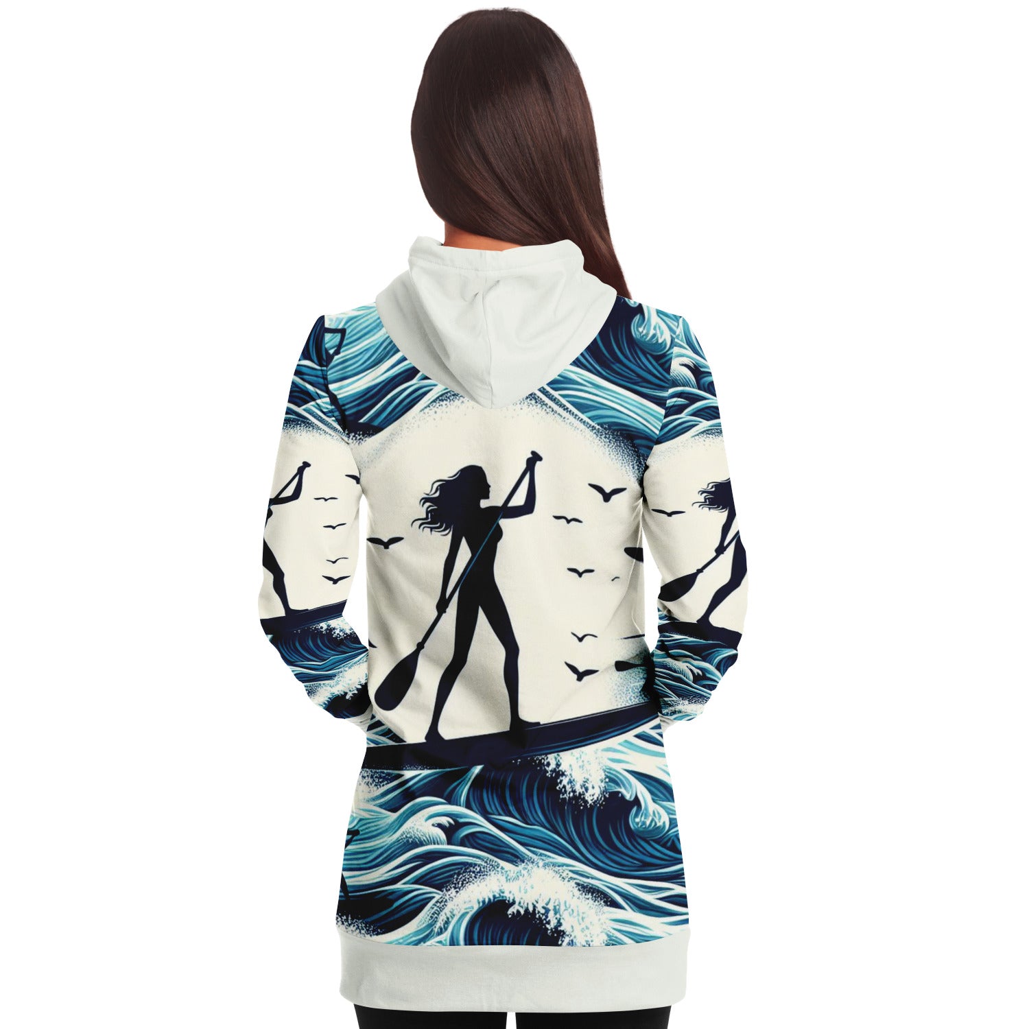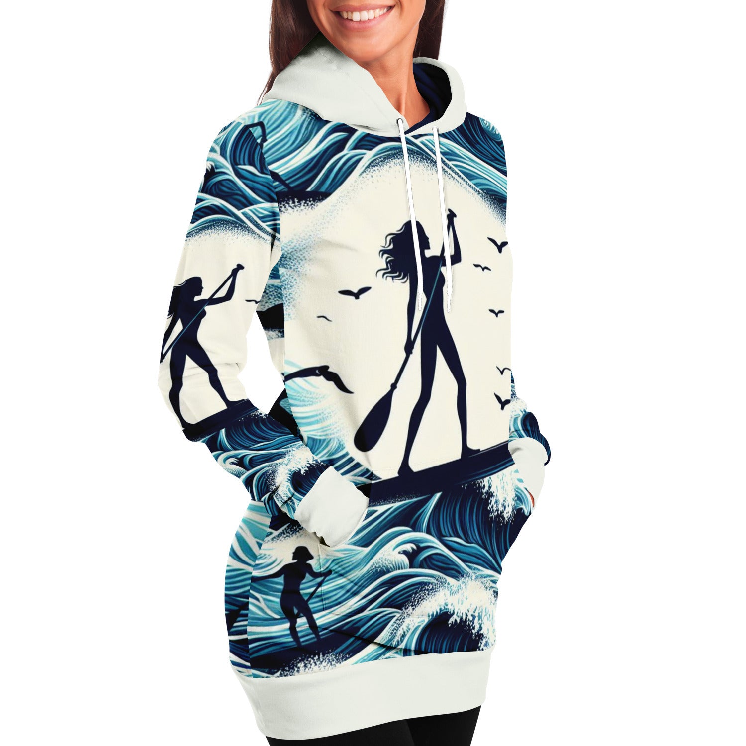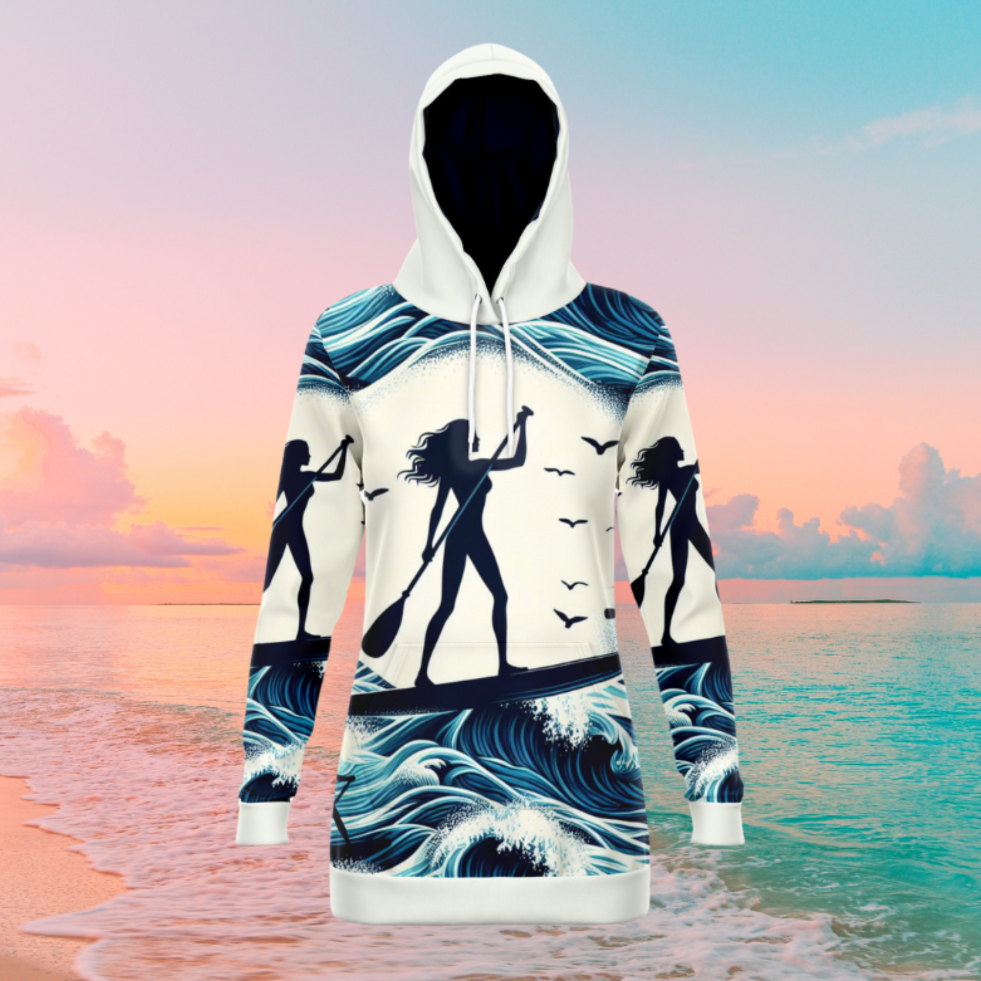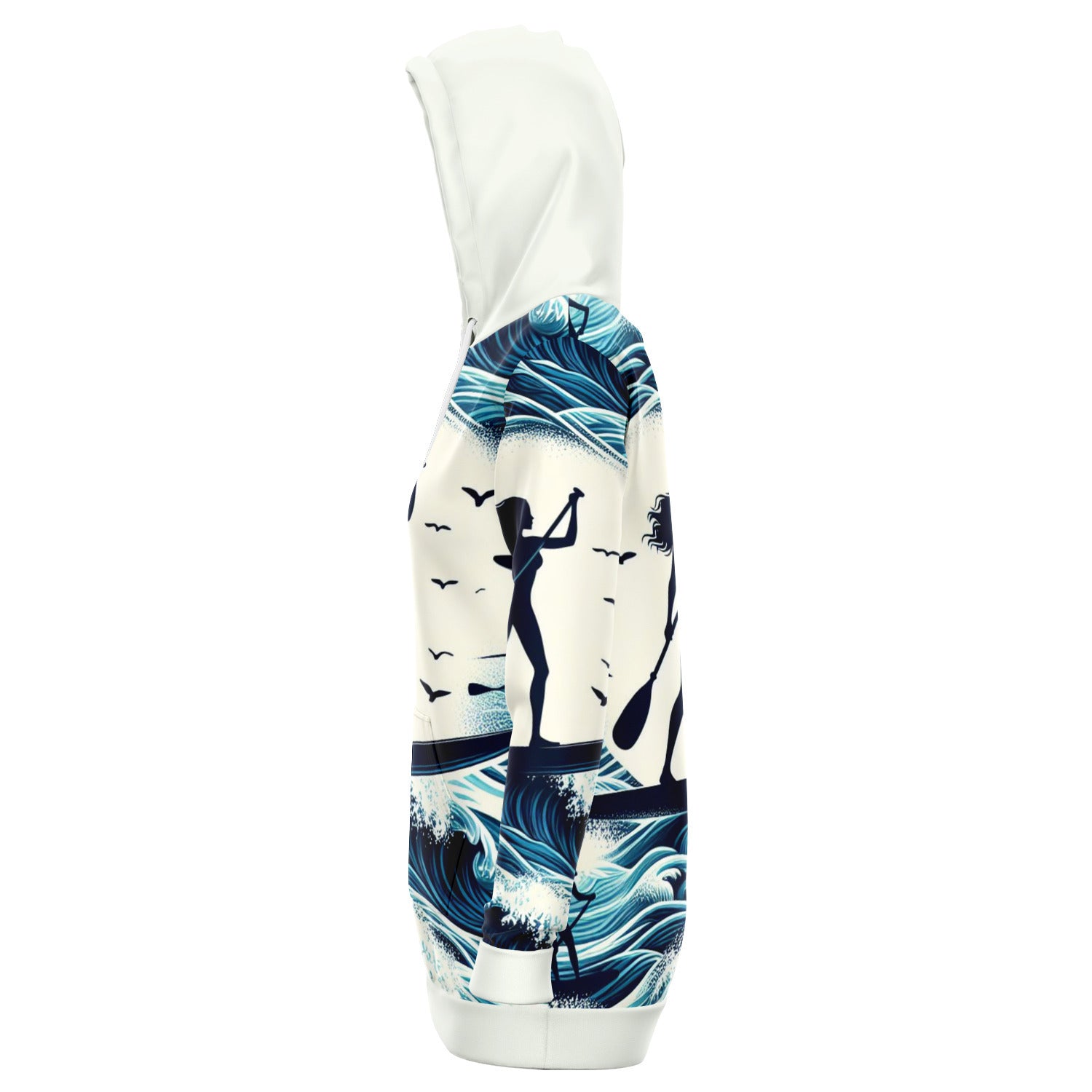 Absolutely stunning and one of our top sellers! This cozy longline hoodie features a beautiful whitish and blue color scheme with a unique paddleboarding woman design at the center of both the front and back, surrounded by gentle wave patterns. Whether you're an active paddleboarder or simply love the beach lifestyle, this hoodie is the perfect way to show off your passion.