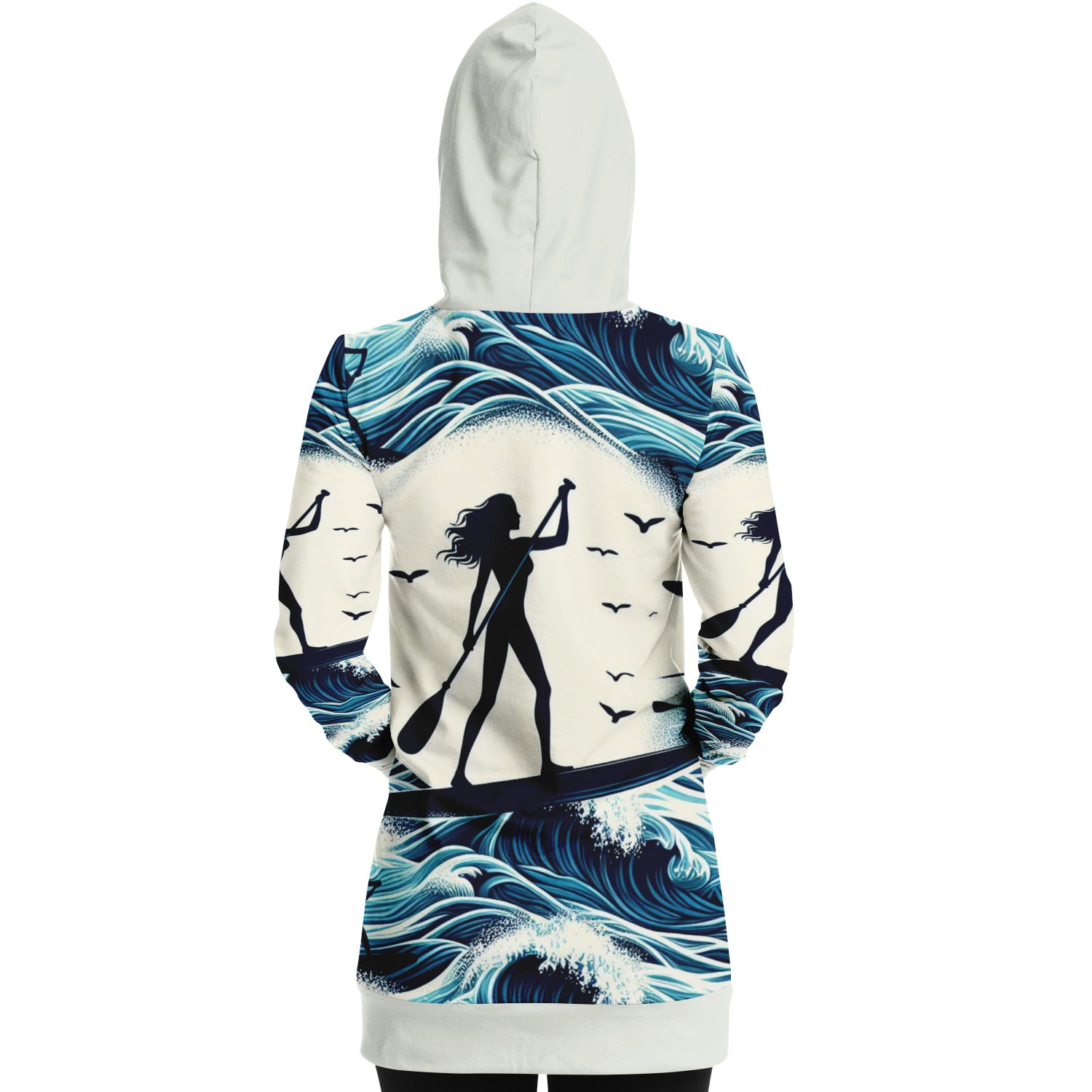 Women's White And Blue Ocean Waves Paddleboarder Longline Athletic Hoodie