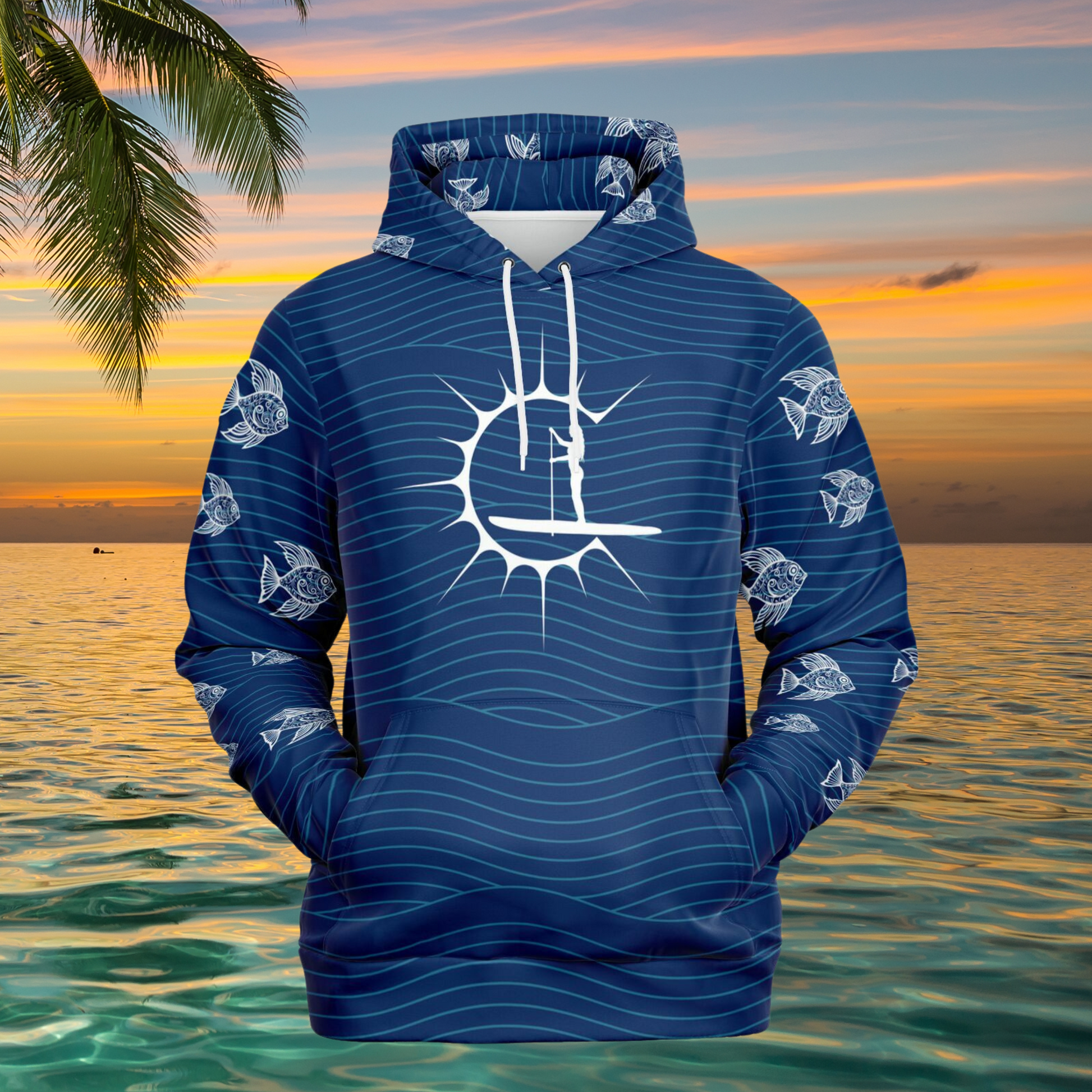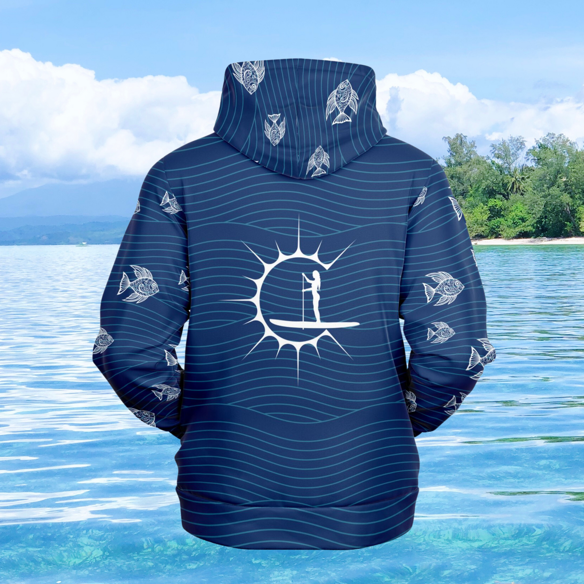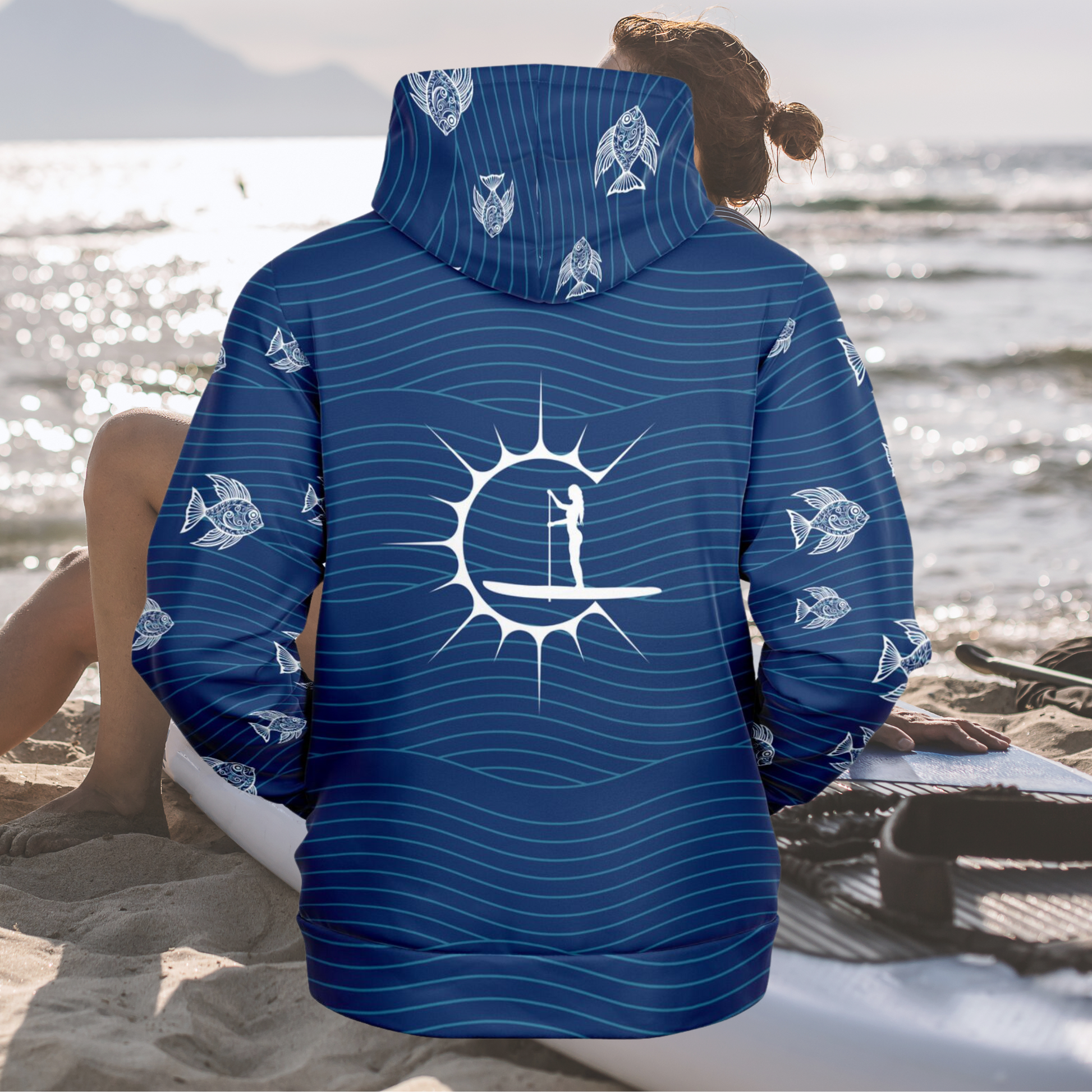 Celebrate your passion for the sea and ocean with this stunning darker blue beach fashion hoodie. The gentle wave pattern serves as a serene backdrop, complemented by a school of fish elegantly woven into the sleeves and hood. The sun with a paddleboarding girl element brings the joy of a sunny paddle. Whether you're by the beach or dreaming of it, this hoodie is designed to keep you cozy and inspired.