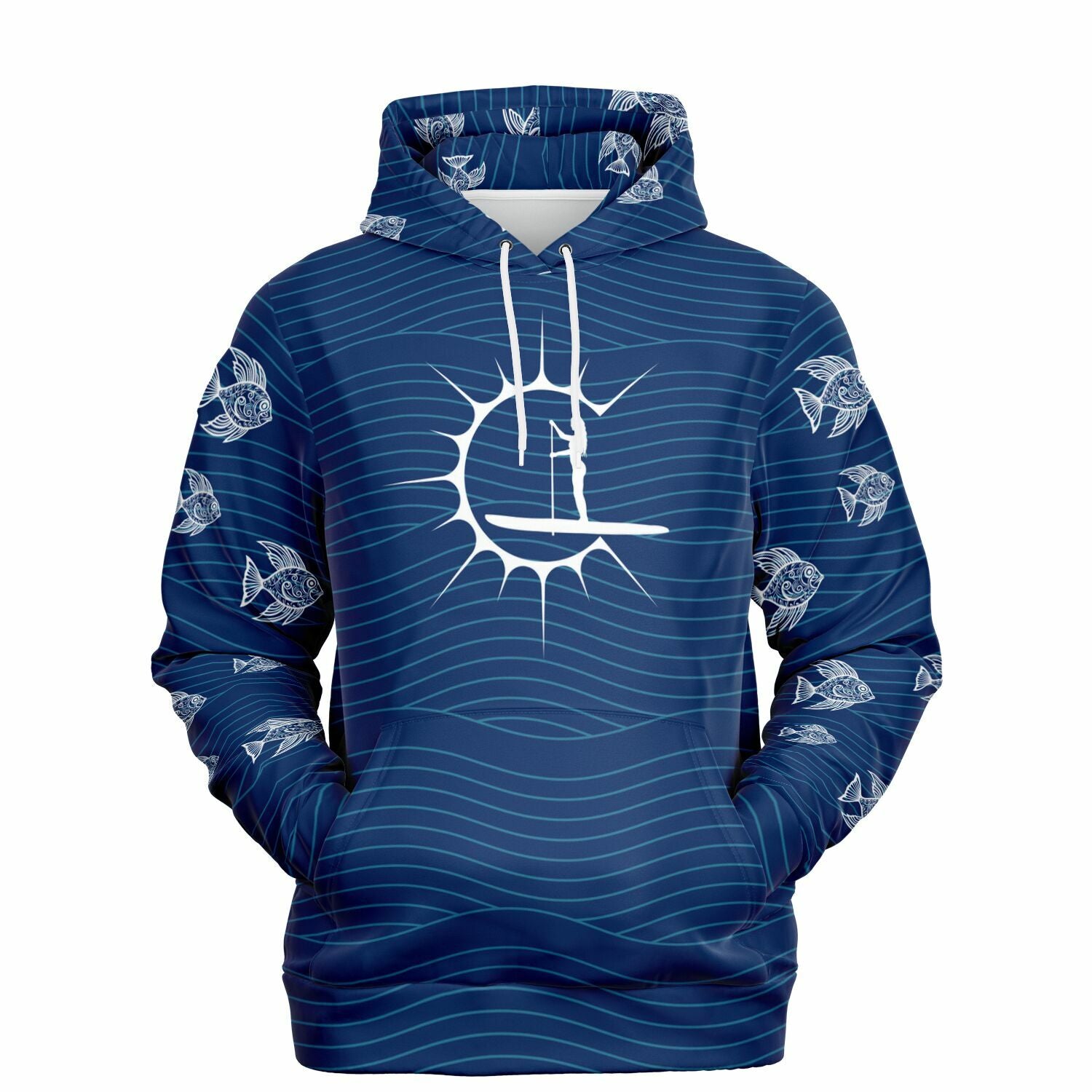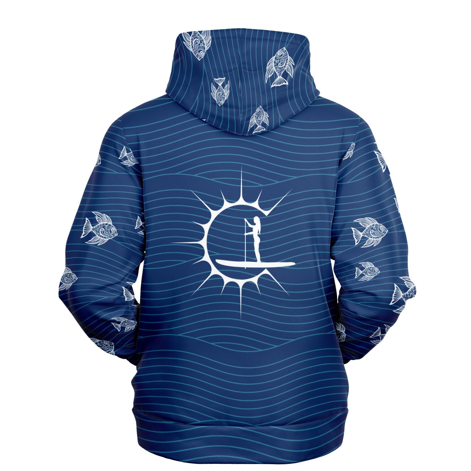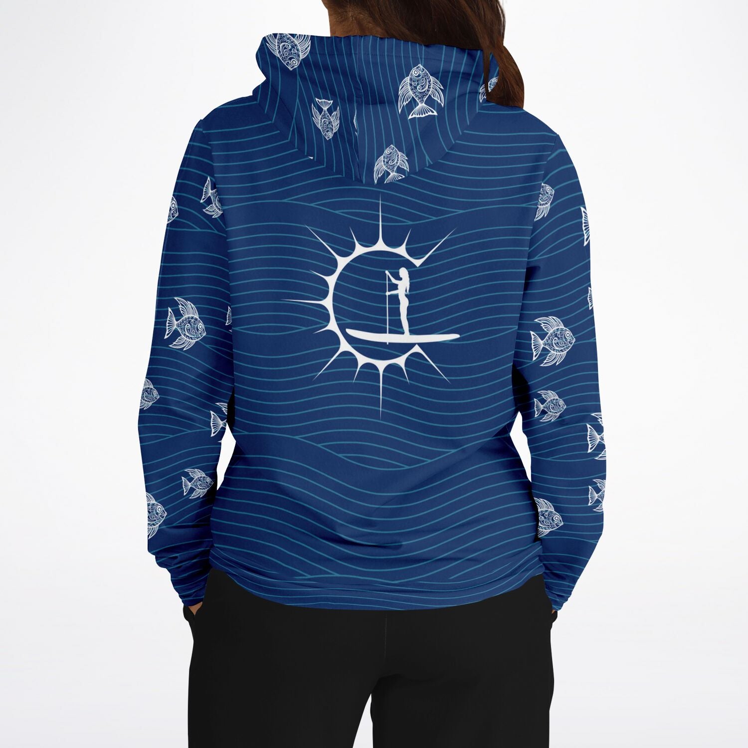 Celebrate your passion for the sea and ocean with this stunning darker blue beach fashion hoodie. The gentle wave pattern serves as a serene backdrop, complemented by a school of fish elegantly woven into the sleeves and hood. The sun with a paddleboarding girl element brings the joy of a sunny paddle. Whether you're by the beach or dreaming of it, this hoodie is designed to keep you cozy and inspired.
