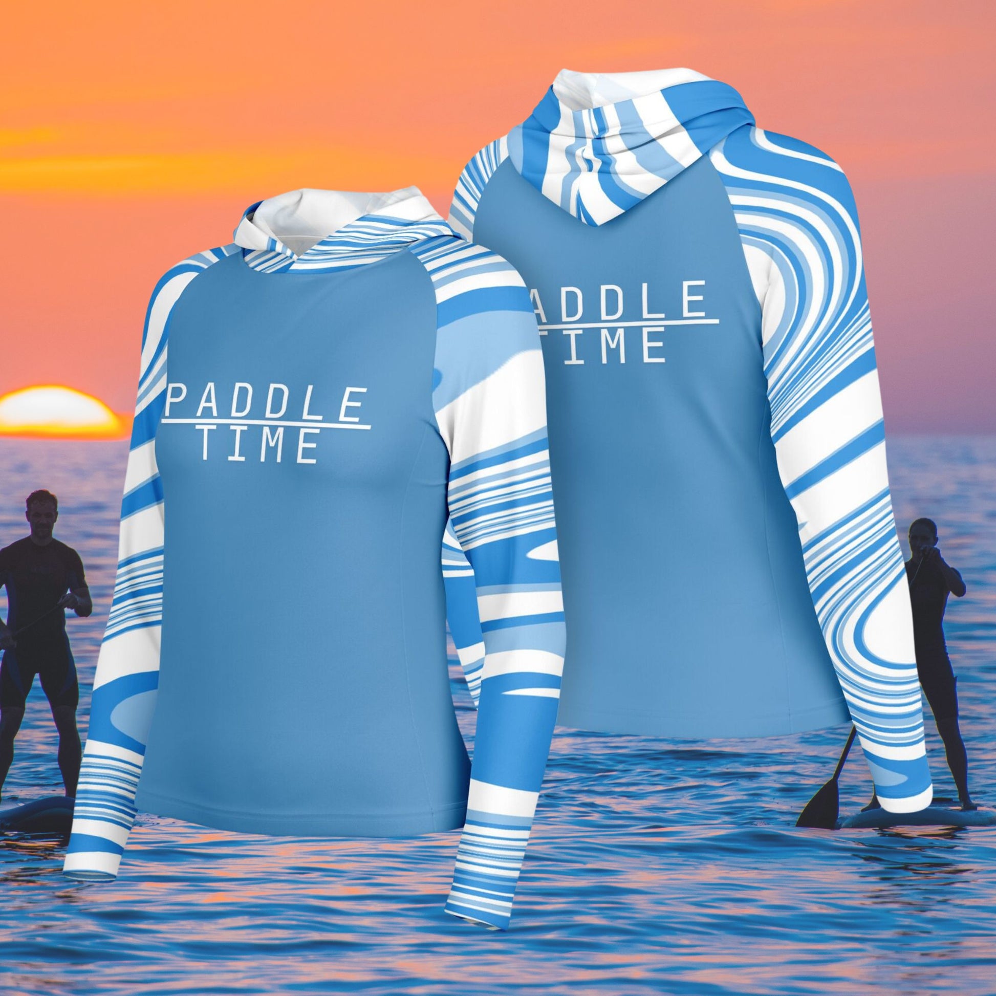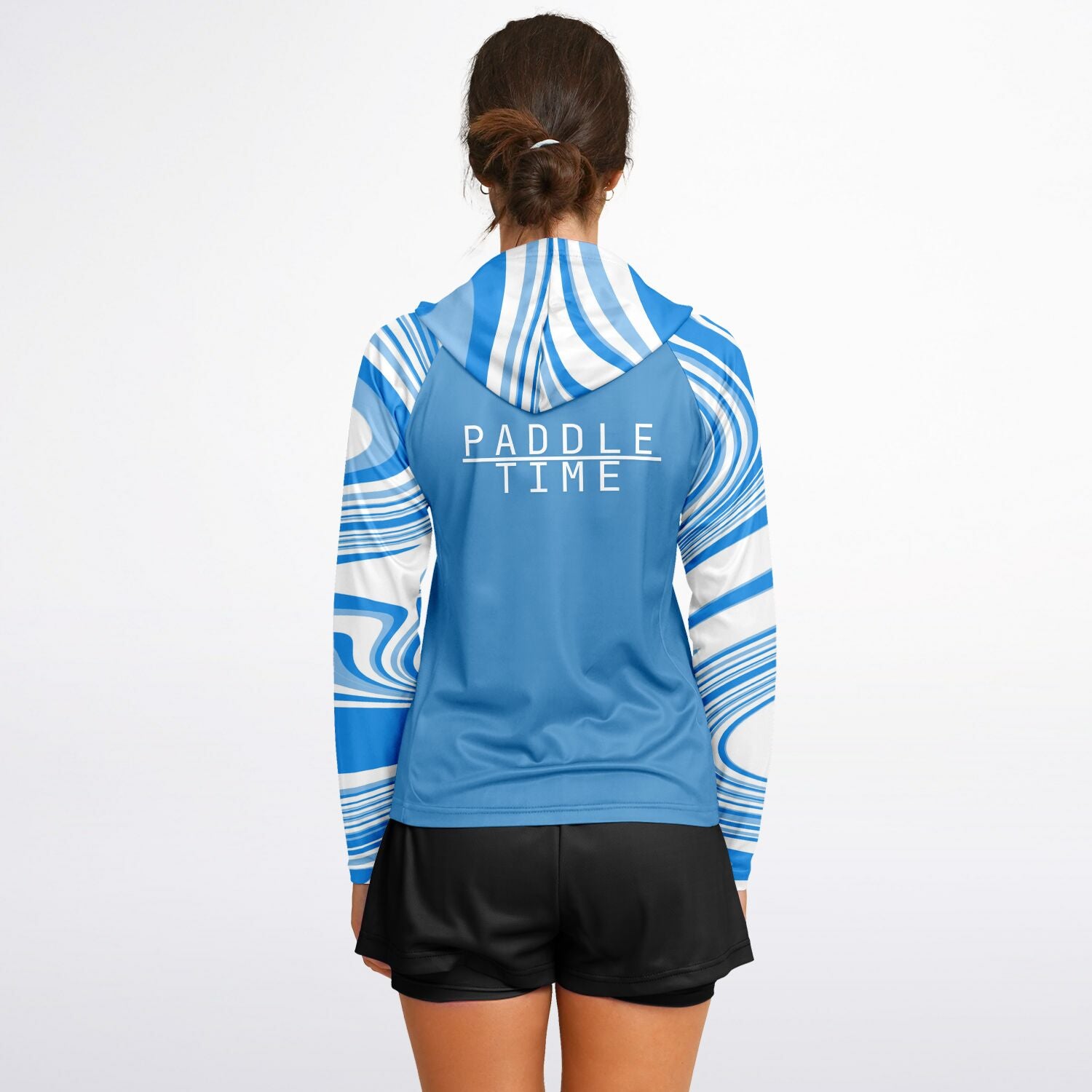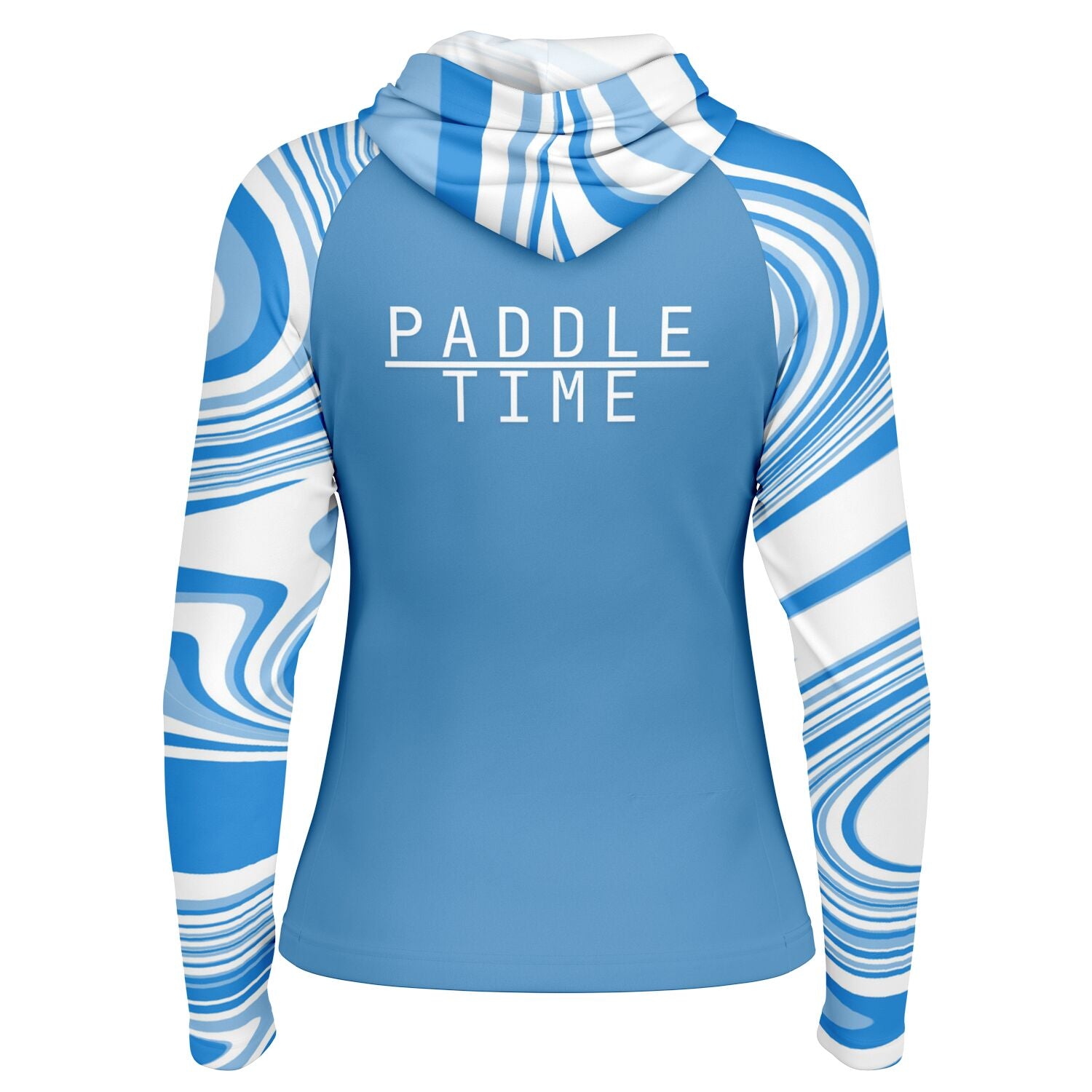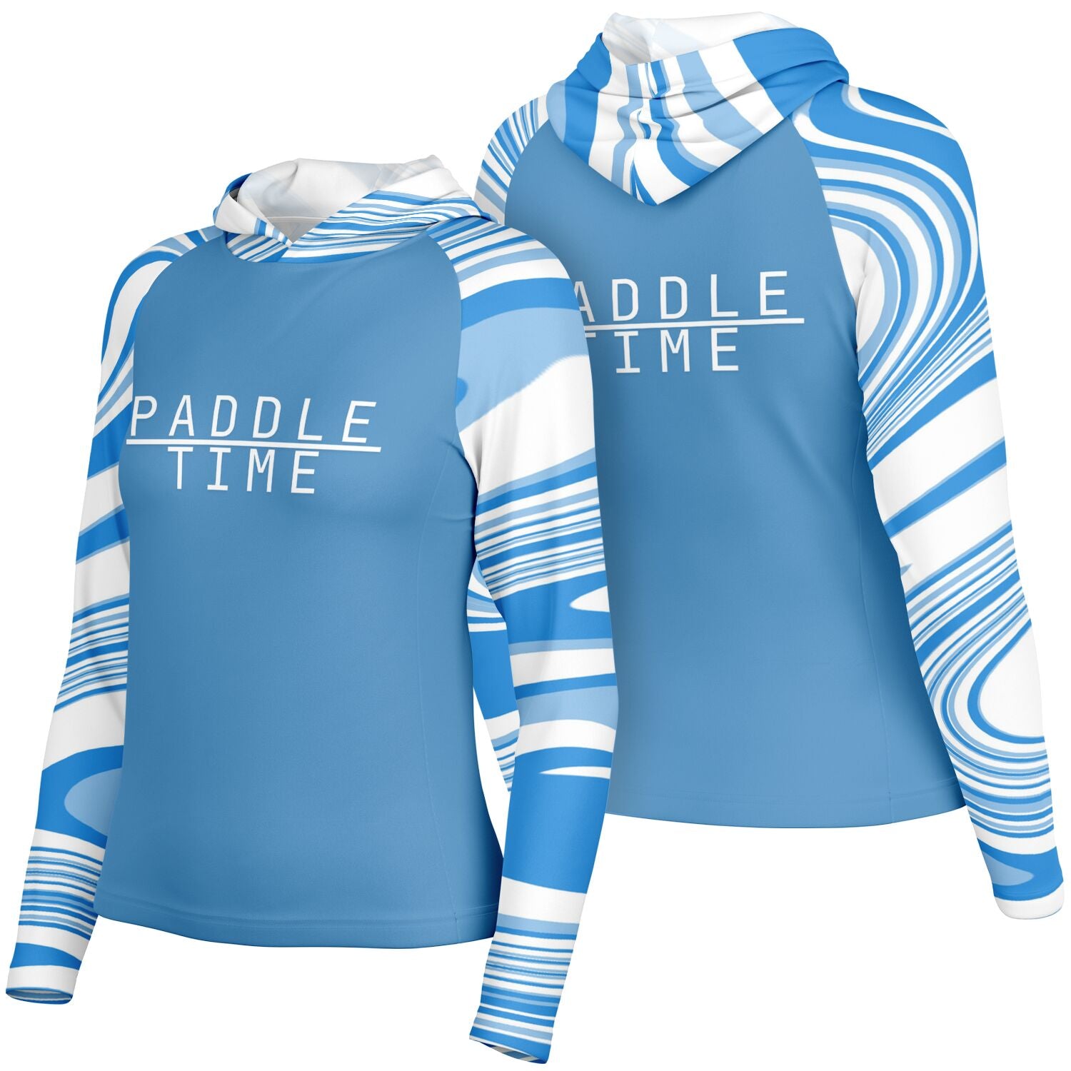 Step up your paddle game and enjoy the outdoors in our lightweight, cooling and dry quick stylish blue and white Paddle Time hooded shirt designed for any active woman.