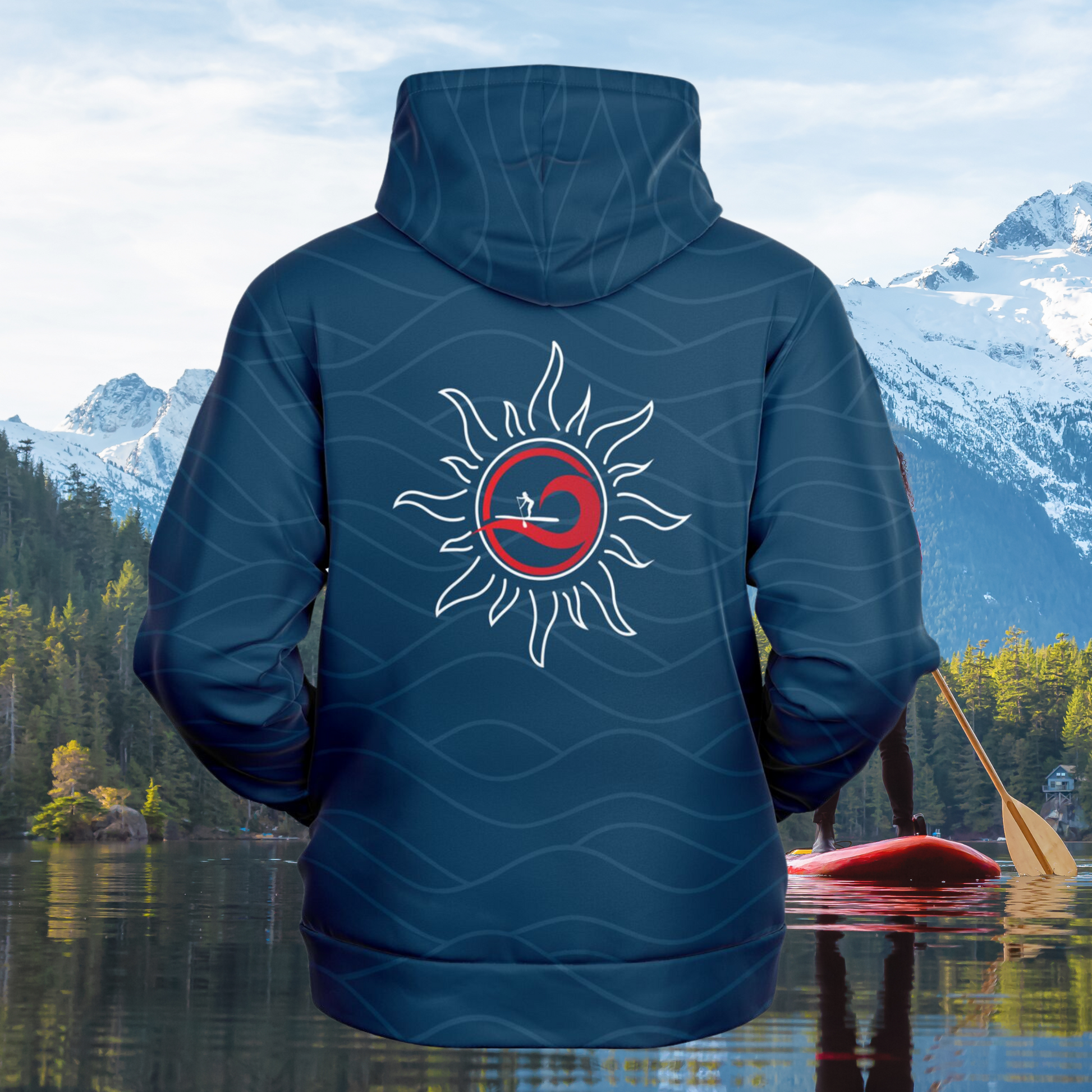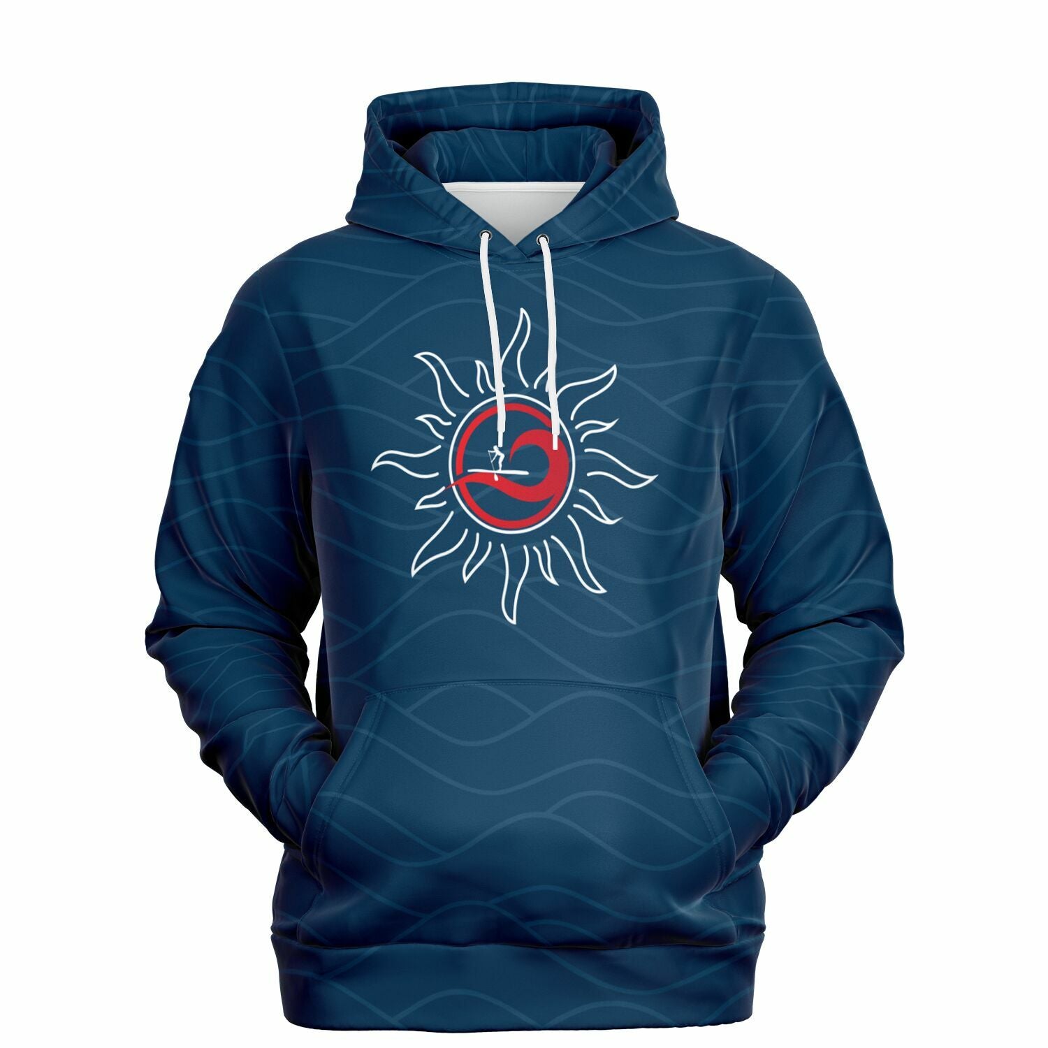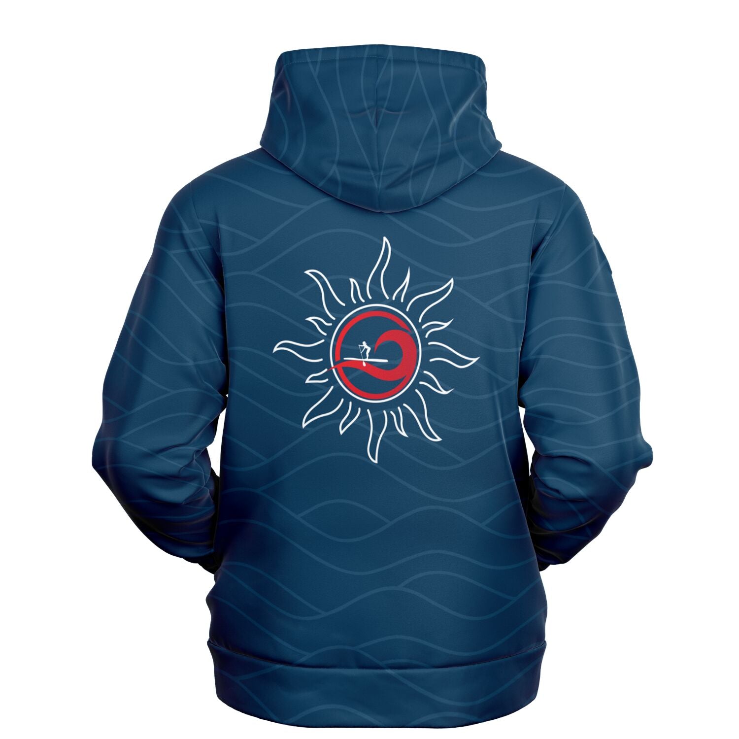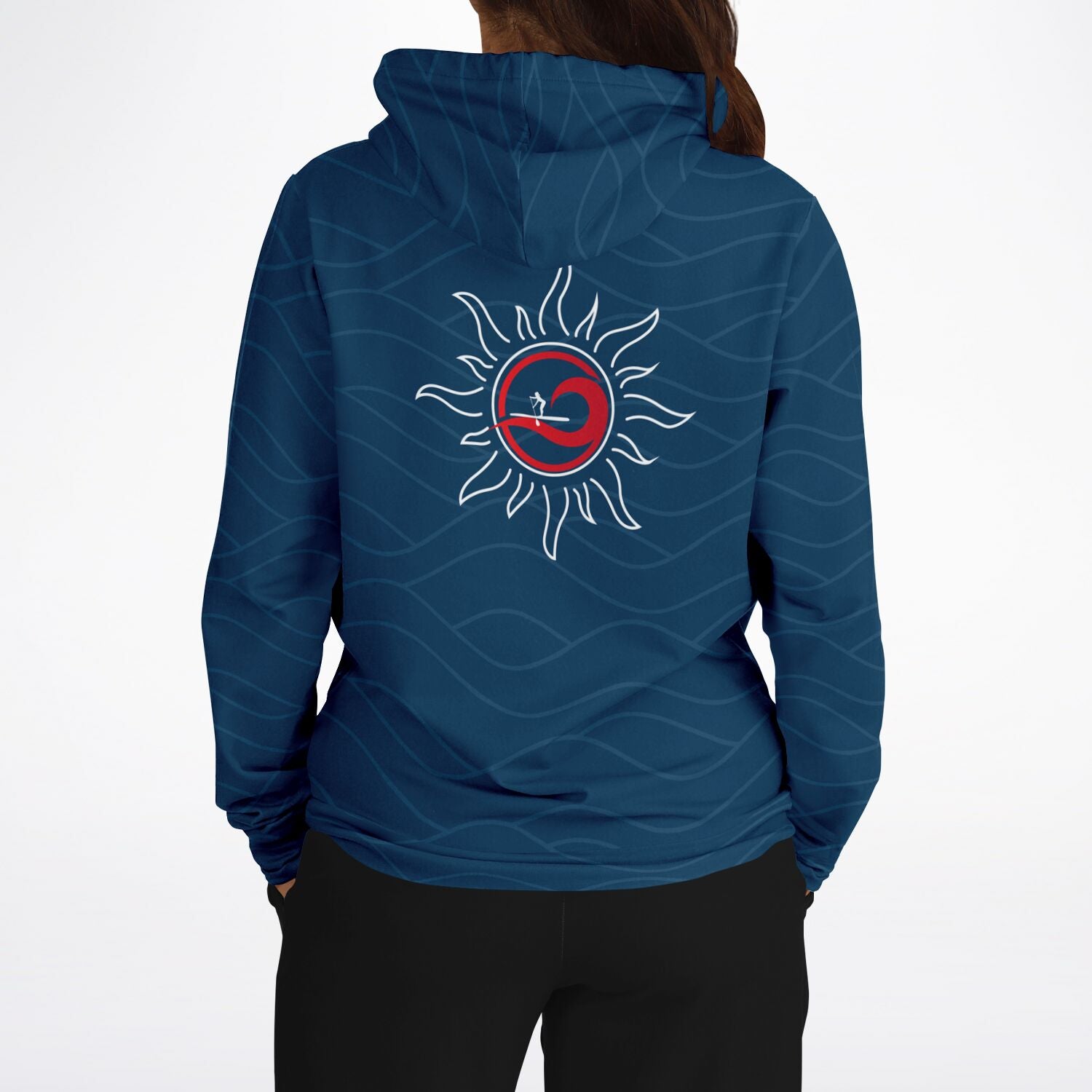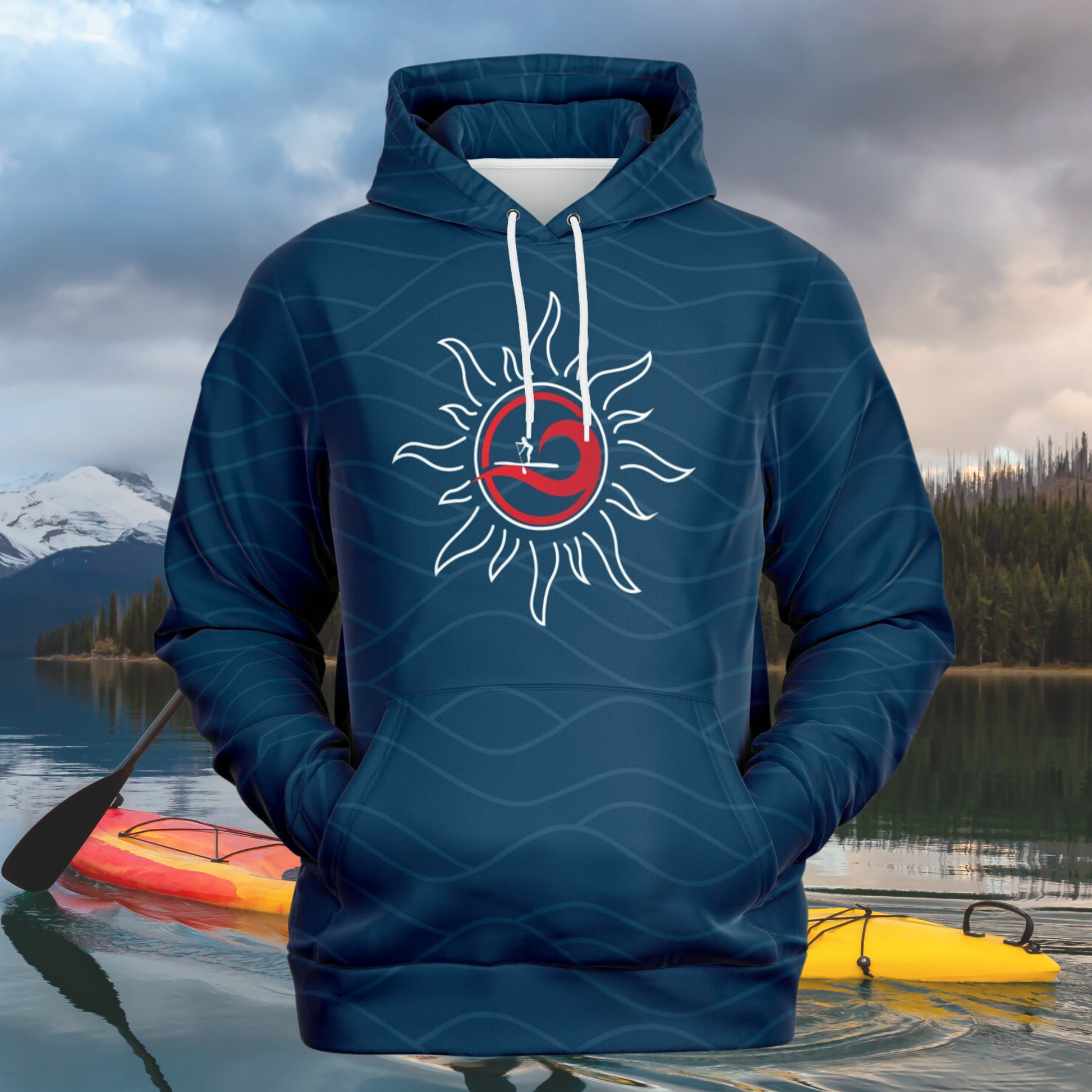 Our navy blue fashion hoodie with soft wave pattern throughout, complemented by a striking white sun element. Inside the sun, a bold red wave and paddleboarding woman stand out, adding a unique and feminine touch to this cozy, stylish hoodie.