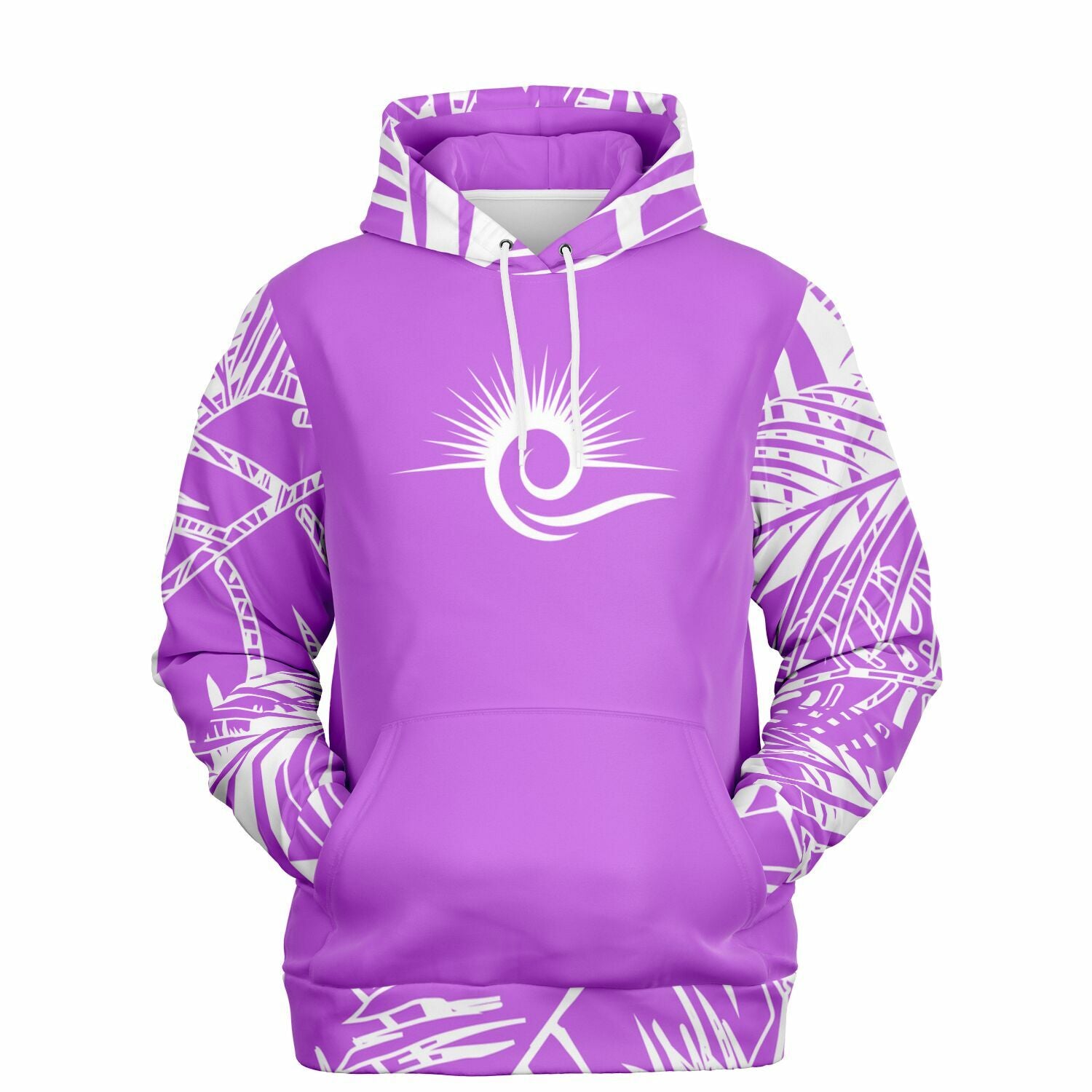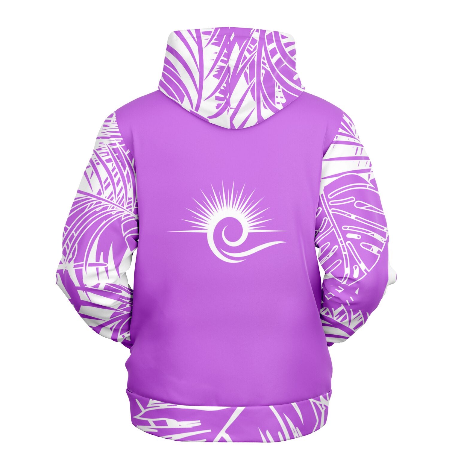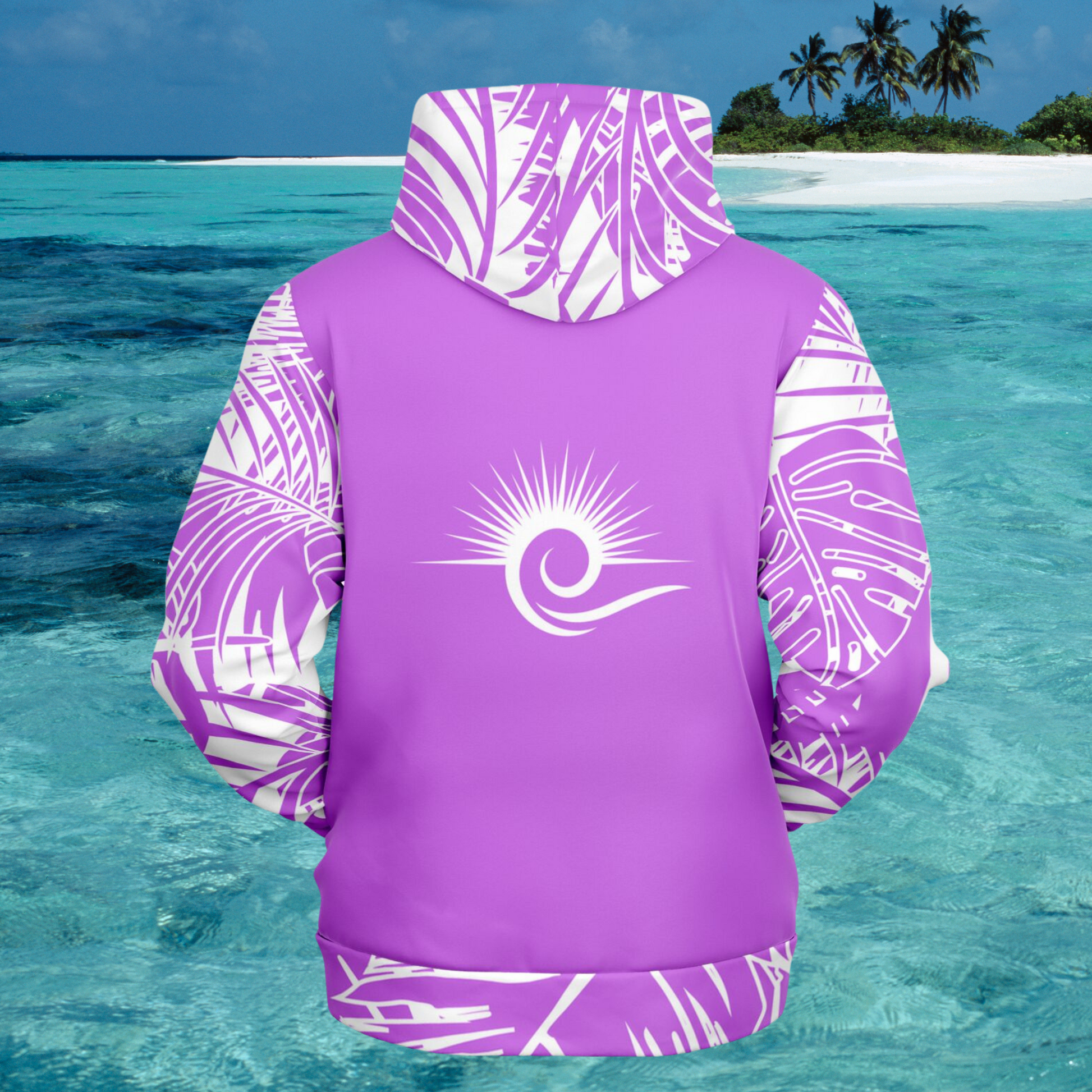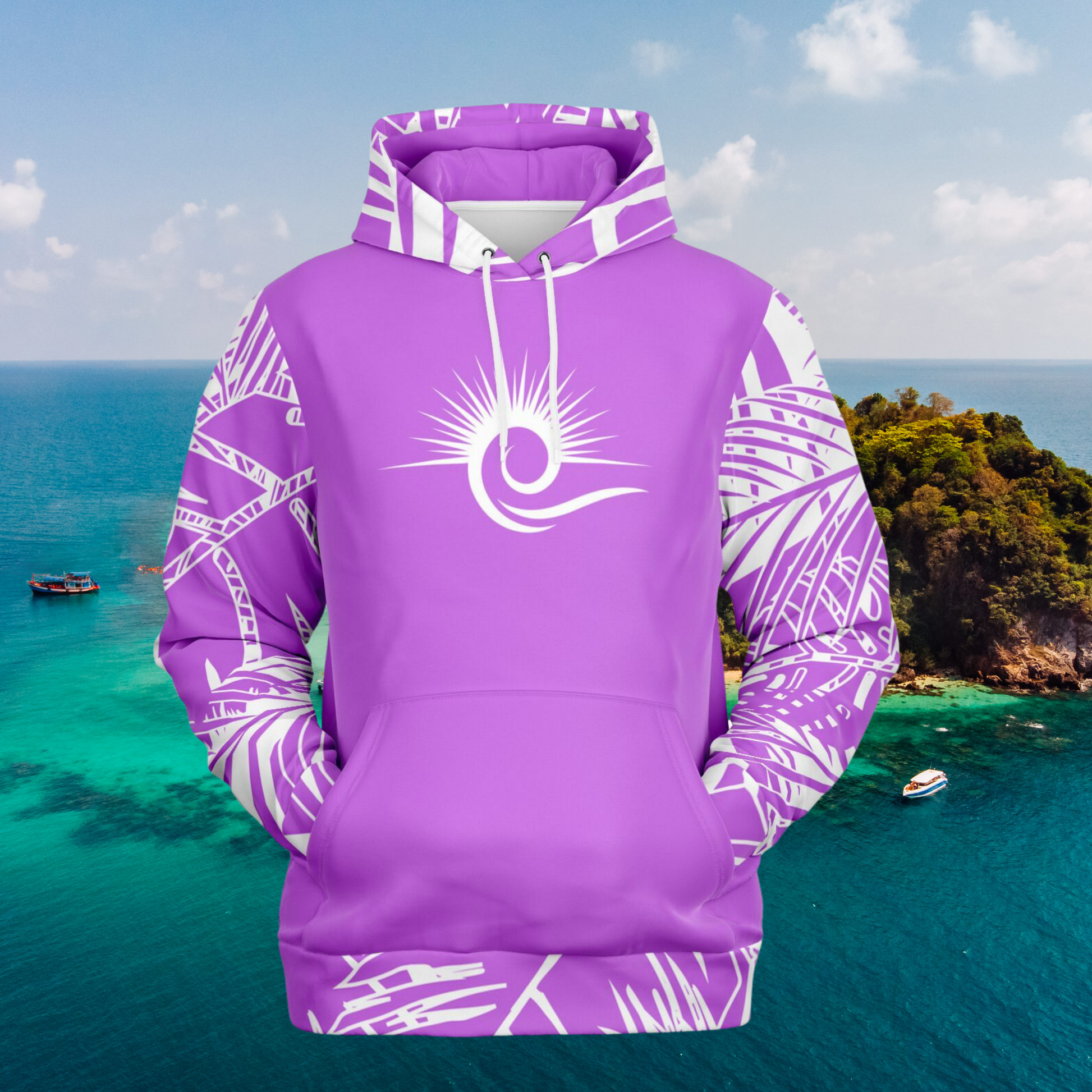 Bring the island vibes to your everyday look with this eye-catching hoodie. The rich purple and crisp white color combo is the perfect backdrop for the tropical palm leaves that cover the sleeves, hood, and pocket. With a sun and wave element in the center, this hoodie is a must-have for those who crave the laid-back lifestyle of sun, surf, and sand. Add it to your wardrobe and feel the warmth of the tropics all year round.
